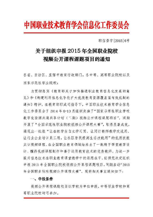 关于组织申报2015年全国职业院校视频公开课程课题项目申报通知